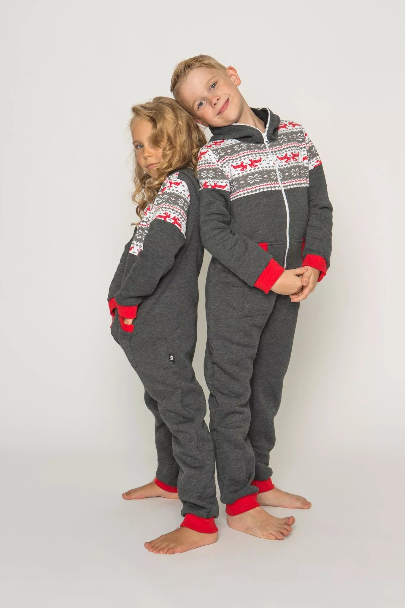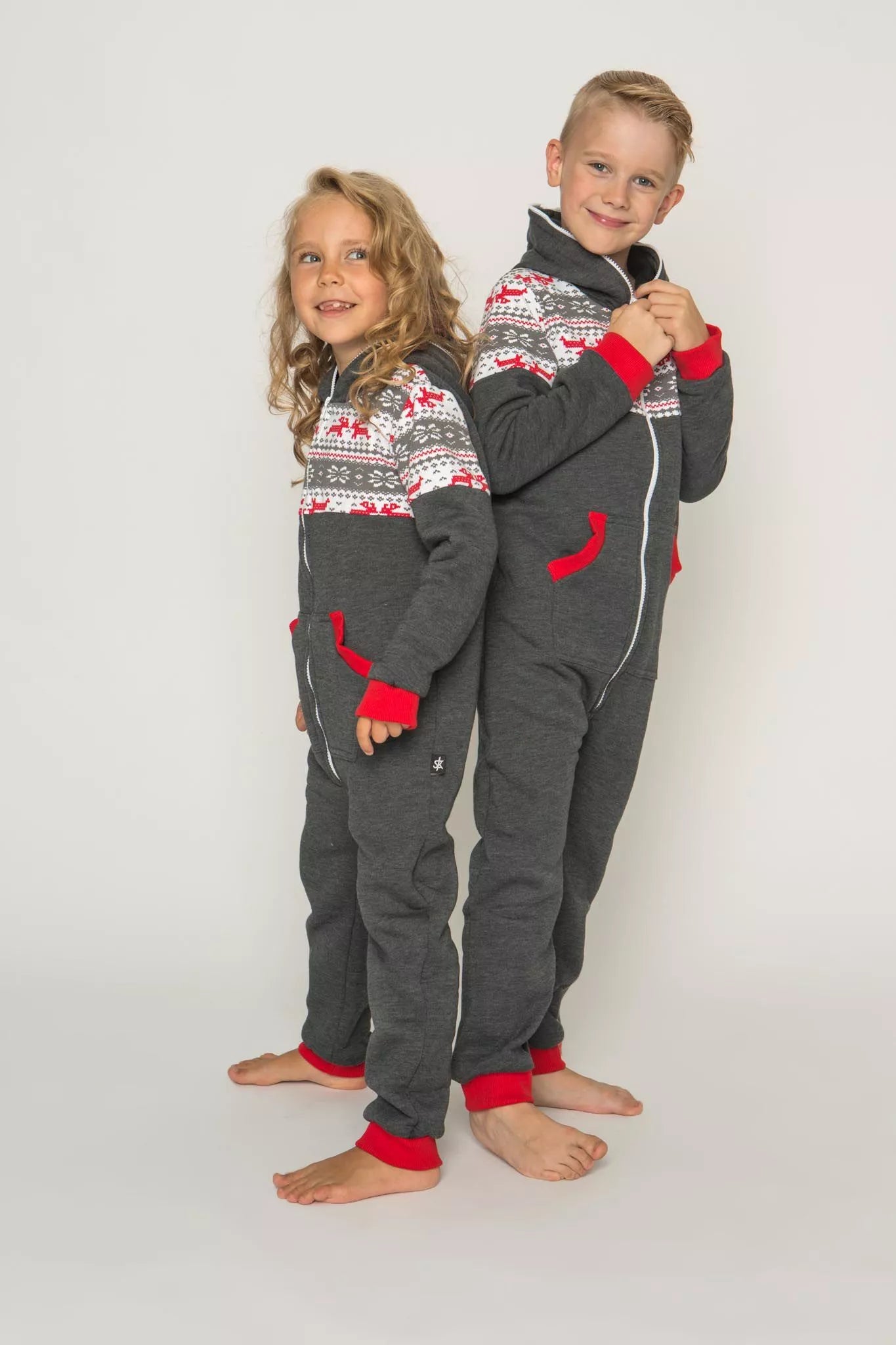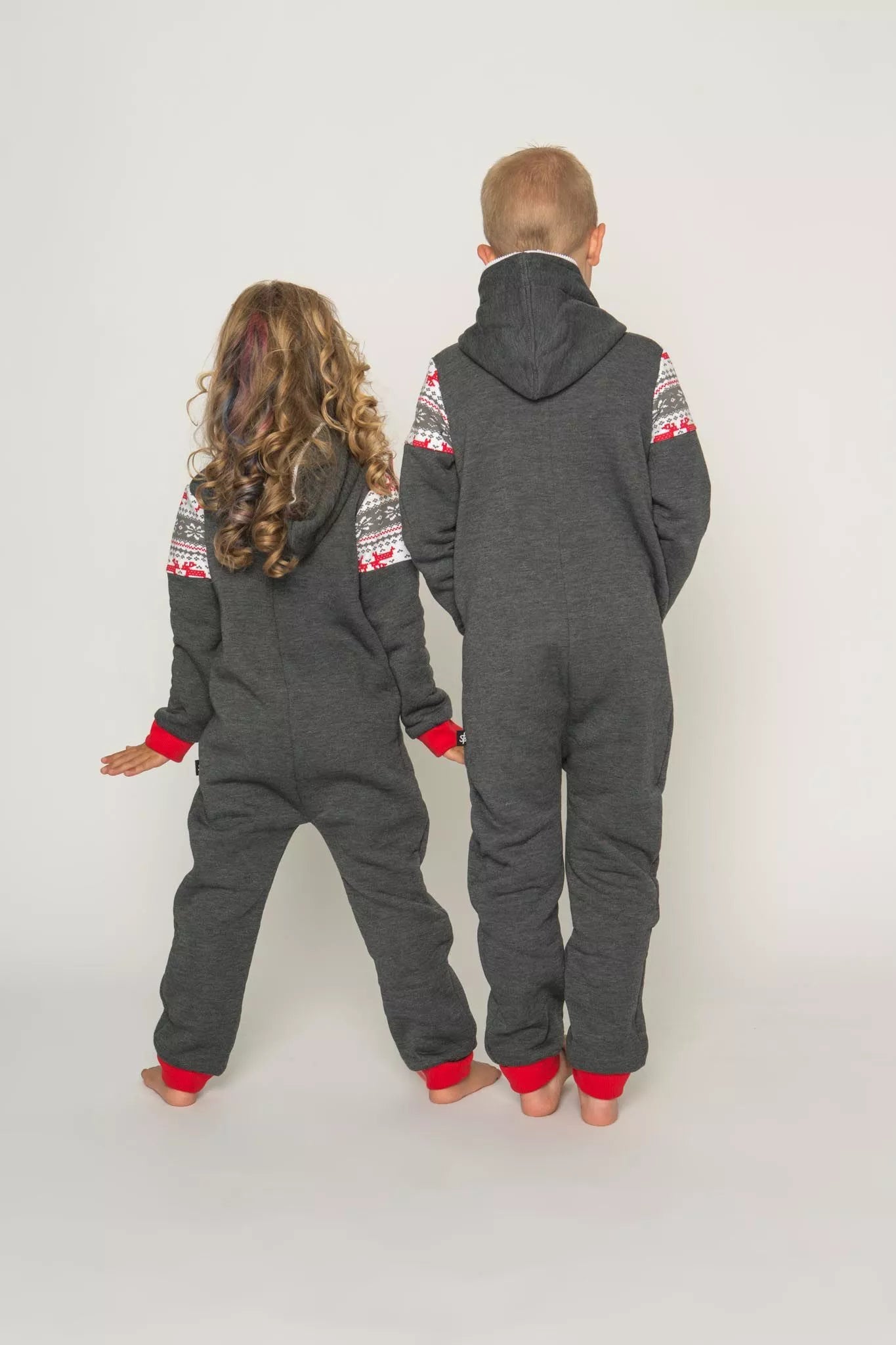 Sofa Killer grafito spalvos vaikiškas kombinezonas Nordic su elniukų ir snaigių aplikacija, raudoni rankogaliais, tiek mergaitėms tiek berniukams, skirtas visai šeimai. Jums tereikia pasirinki rankogalių spalvą (jei neradote pageidaujamos spalvos susiekite), vaiko ar visos šeimos iniviualumui pabrėžti (užsakant kombineonus šeimai suteikiame nuolaidas - susisiekite). Priekyje kišenės apsiūtos rankogalių medžiaga. Medžiagos vidinė dalis su tankiu pūkeliu, kuris sukuria įpatingą šilumos jausmą ir norą vilkėti kombinezoną nuolat. Sofa Killer kombinezonų modeliai nevaržo judesių, tad puikiai tinka tiek pasyviam tiek aktyviam poilsiui, net miegui. Galite rinktis iš plačios dydžių skalės, o pats rūbas tradiciškai turi būti laisvas, tad kiek didesnis dydis puikiai tiks. Dekoruota Sofa Killer logotipu po kišene. turime nuotraukose matomus modelius.