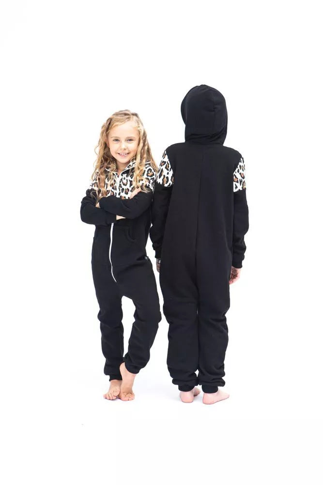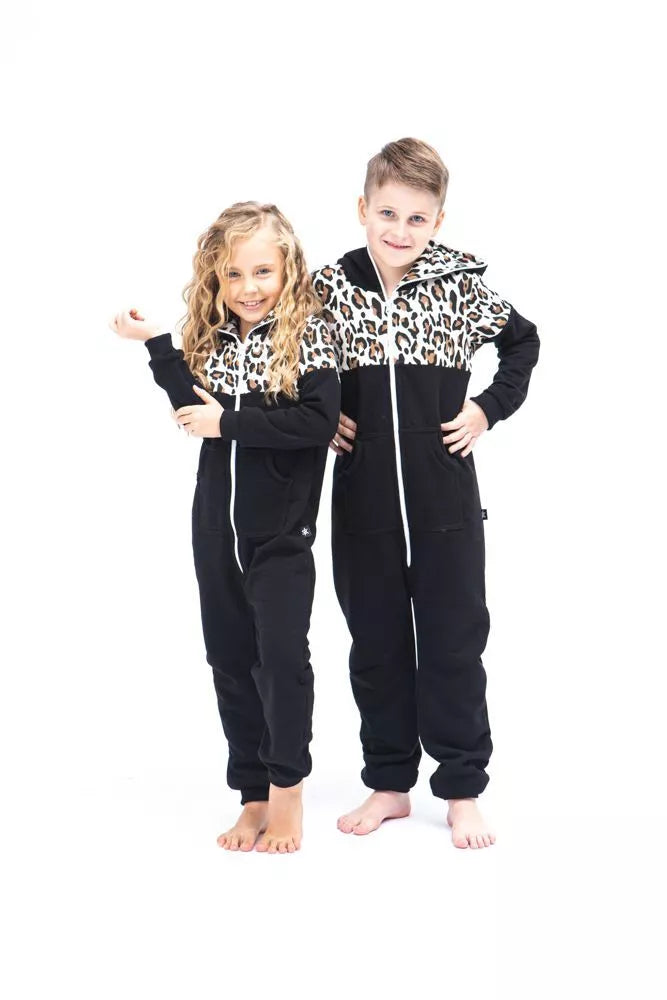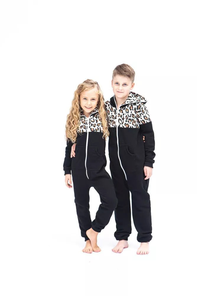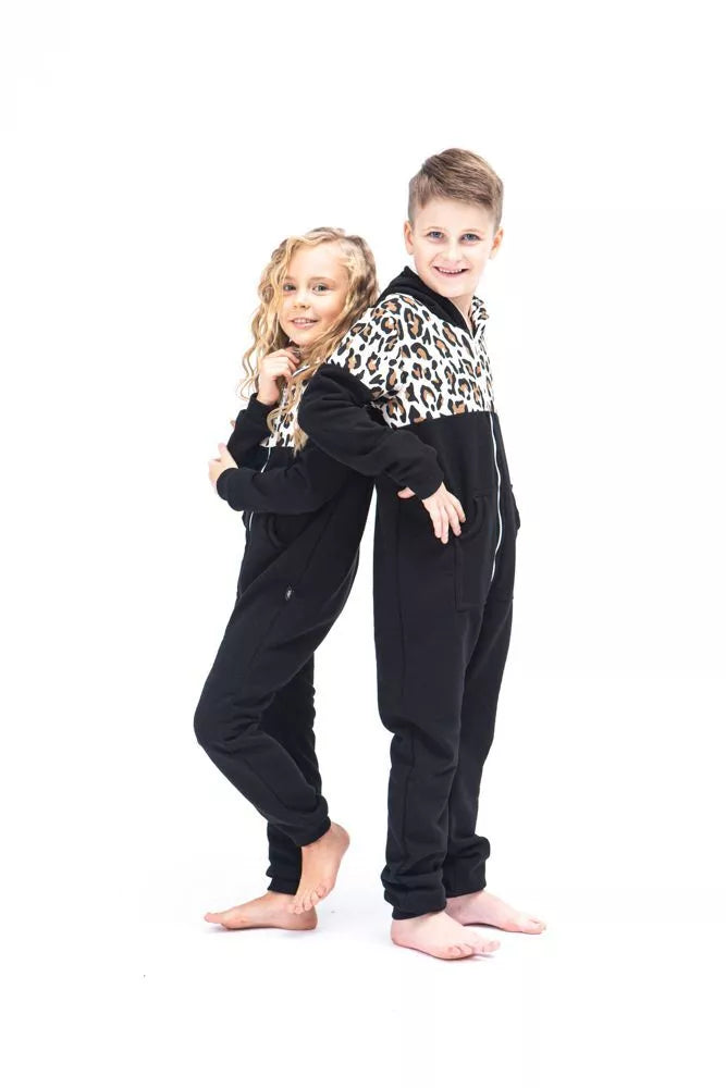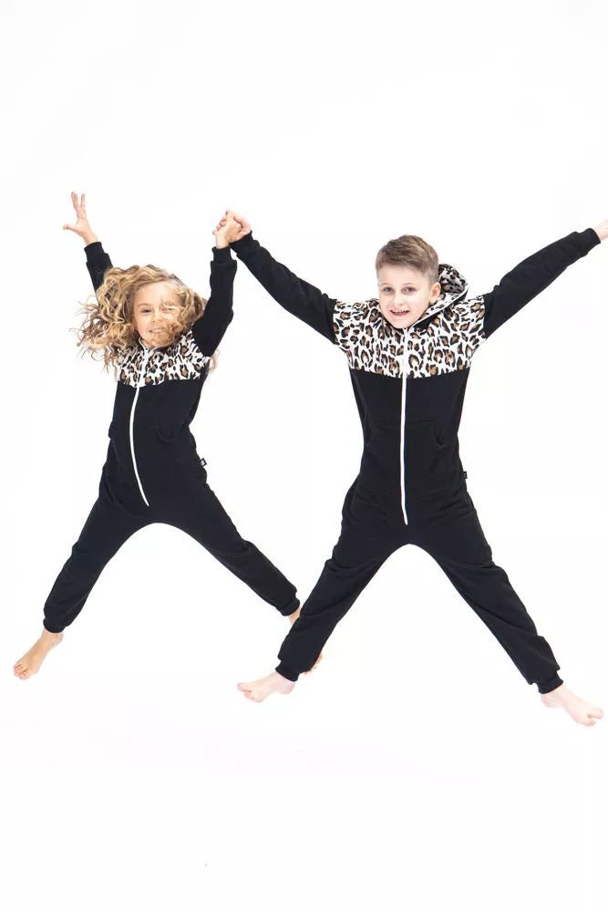 Sofa Killer juodas vaikiškas kombinezonas LEO su leopardo raštu, tiek mergaitėms tiek berniukams, skirtas visai šeimai. Priekyje kišenės apsiūtos rankogalių medžiaga. Medžiagos vidinė dalis su tankiu pūkeliu, kuris sukuria įpatingą šilumos jausmą ir norą vilkėti kombinezoną nuolat. Sofa Killer kombinezonų modeliai nevaržo judesių, tad puikiai tinka tiek pasyviam tiek aktyviam poilsiui, net miegui. Galite rinktis iš plačios dydžių skalės, o pats rūbas tradiciškai turi būti laisvas, tad kiek didesnis dydis puikiai tiks. Dekoruota Sofa Killer logotipu po kišene. turime nuotraukose matomus modelius.