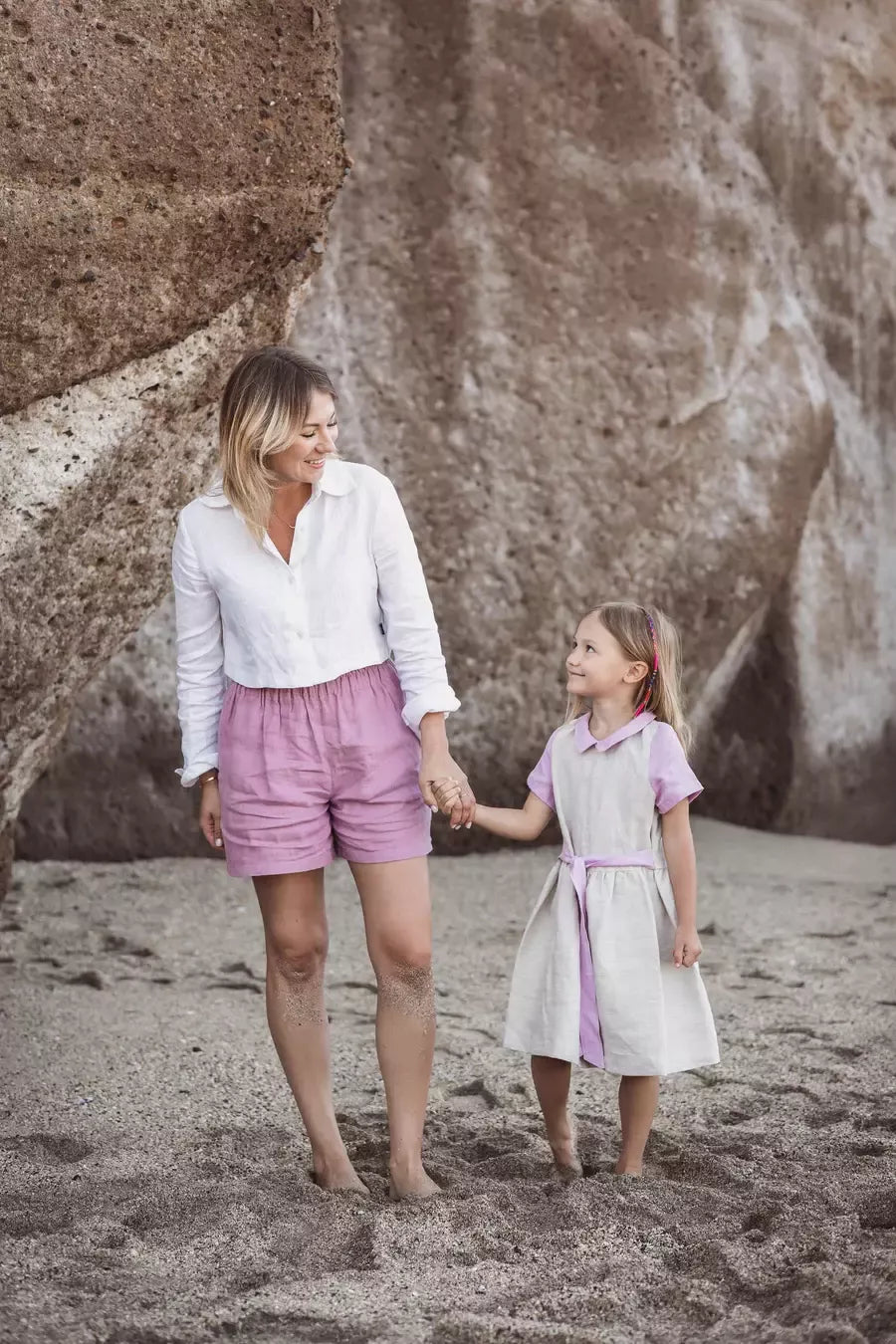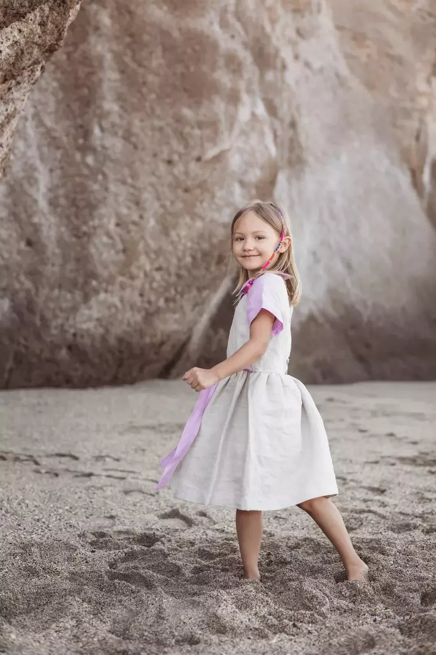 Sofa Killer smėlio spalvos vaikiška lininė suknelė su violetine apykakle