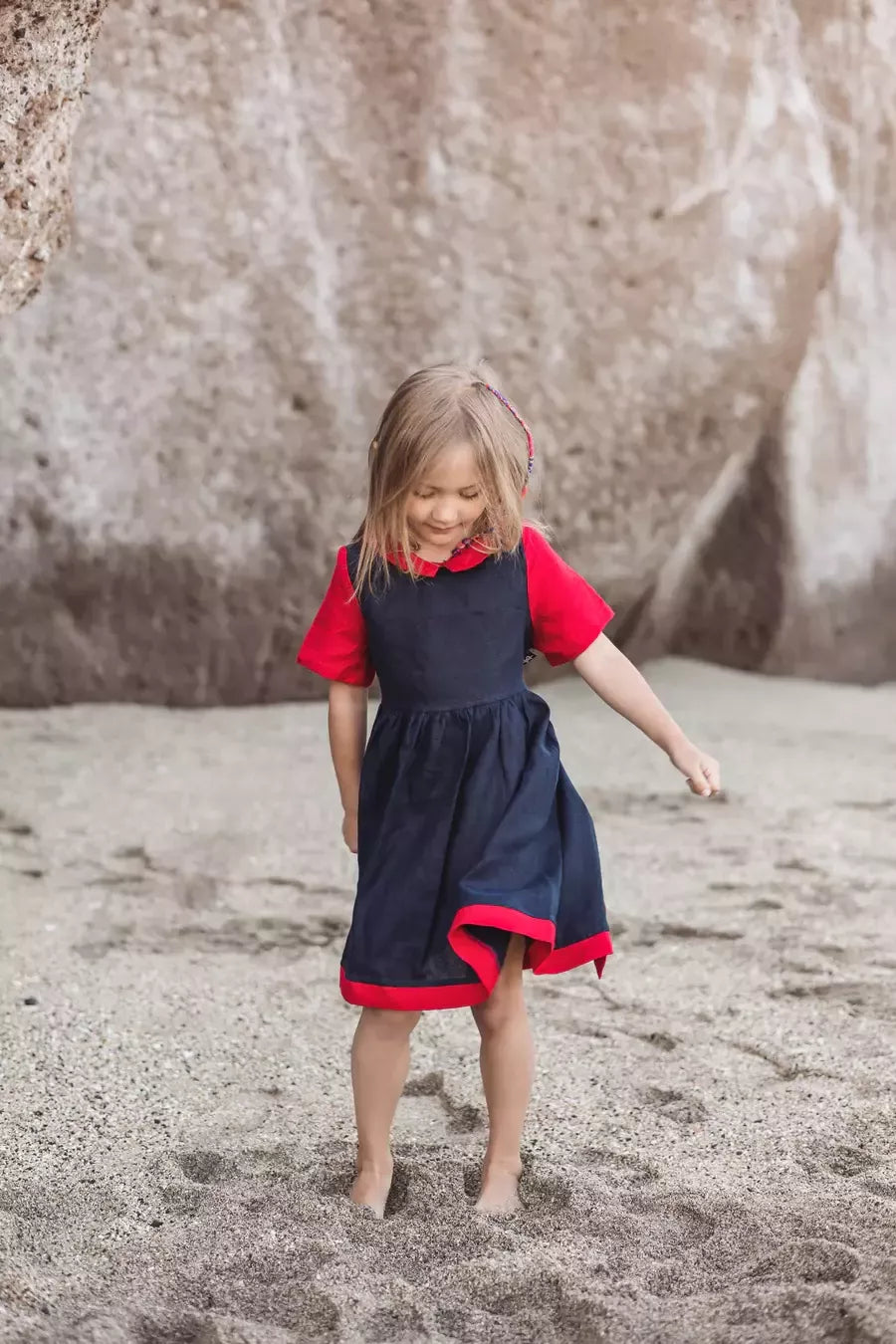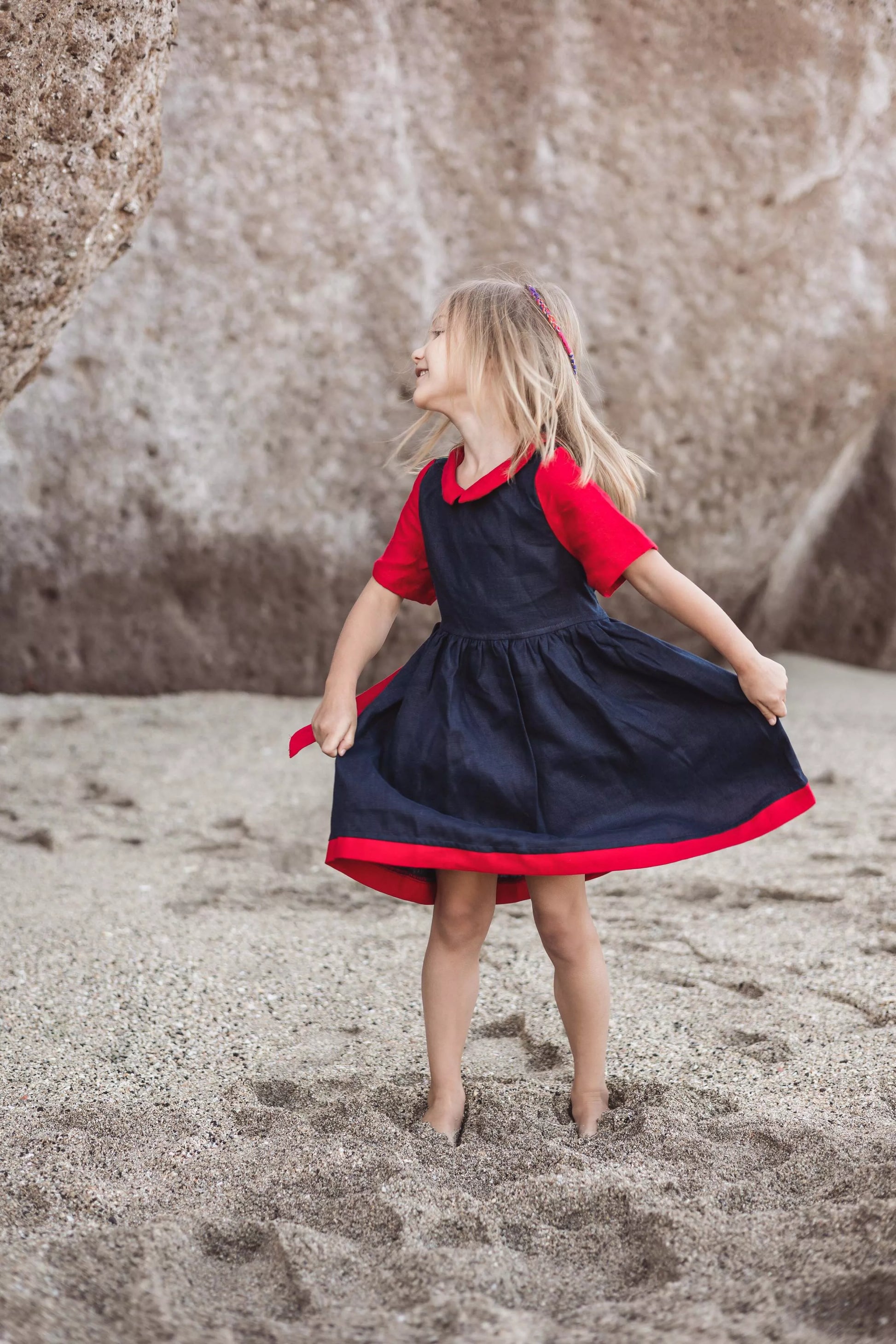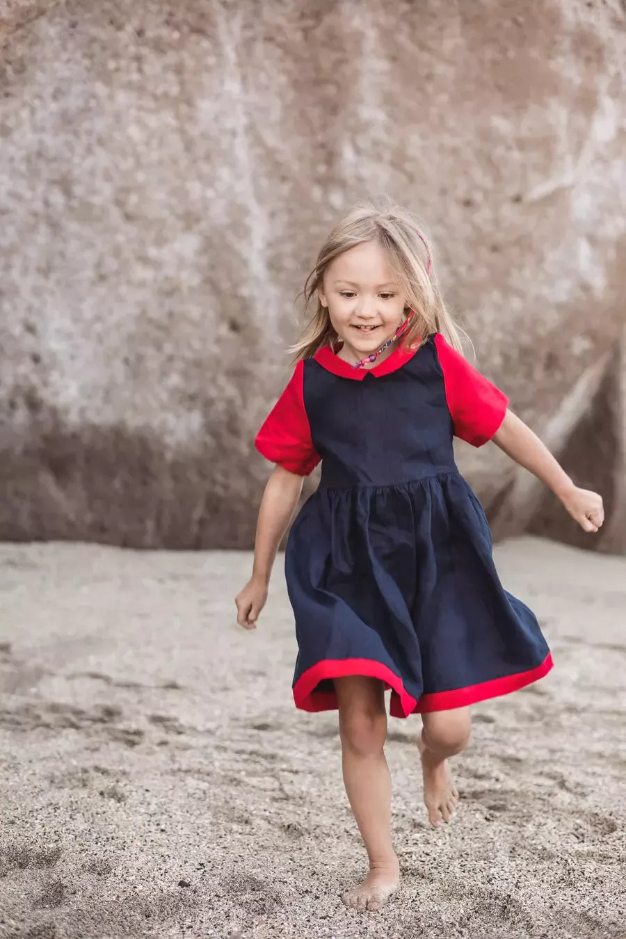 Sofa Killer tamsiai mėlynos ir raudonos spalvos vaikiška lininė suknelė