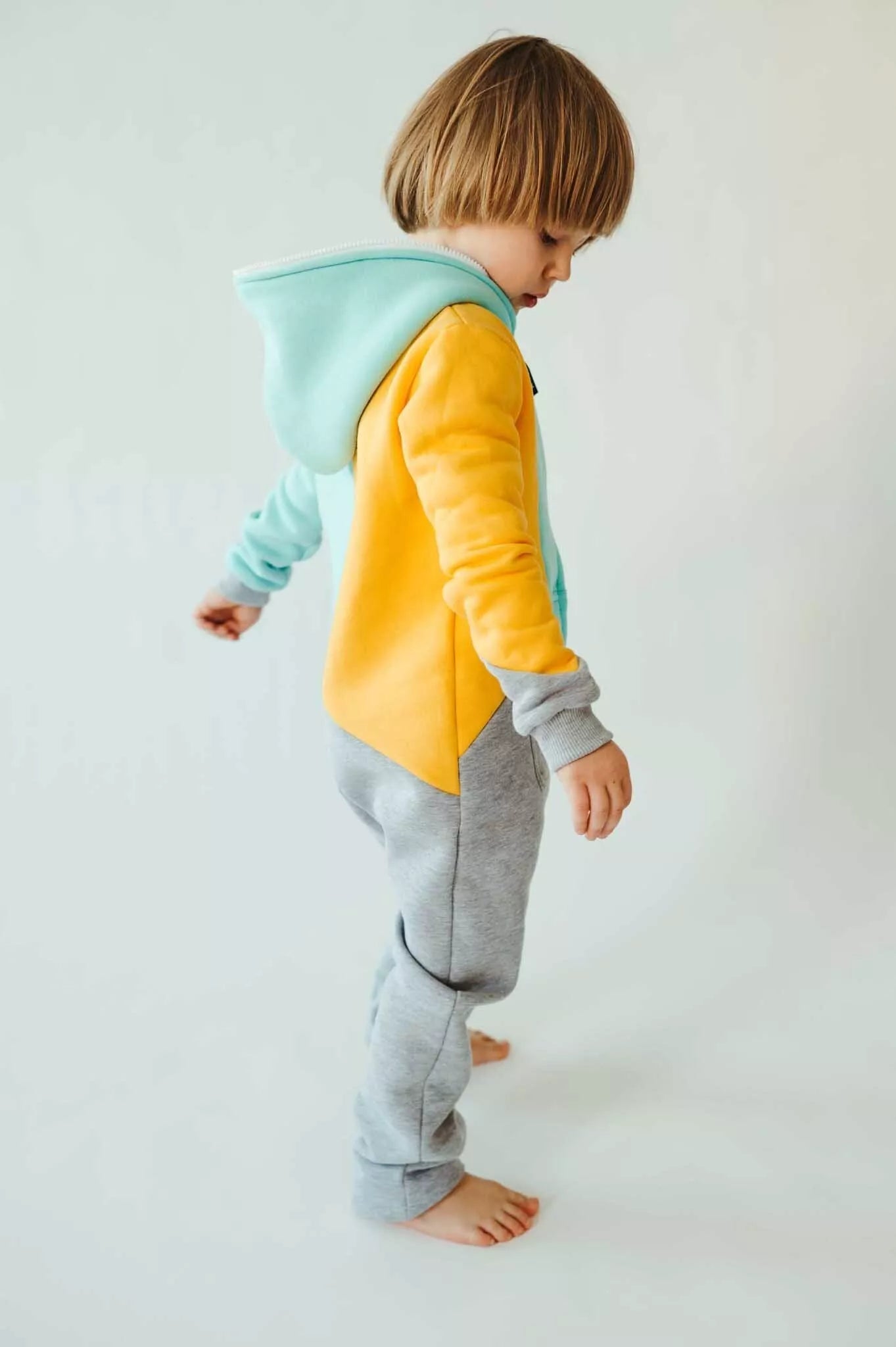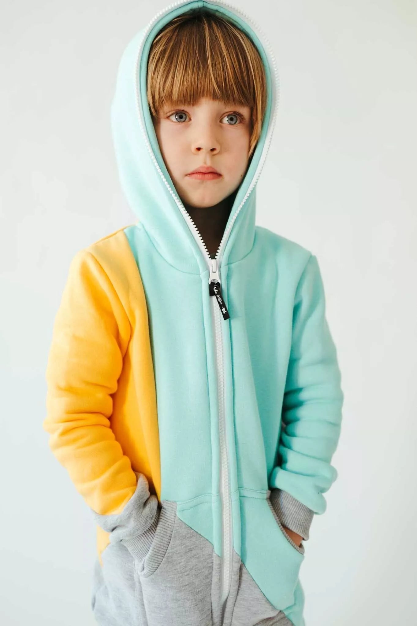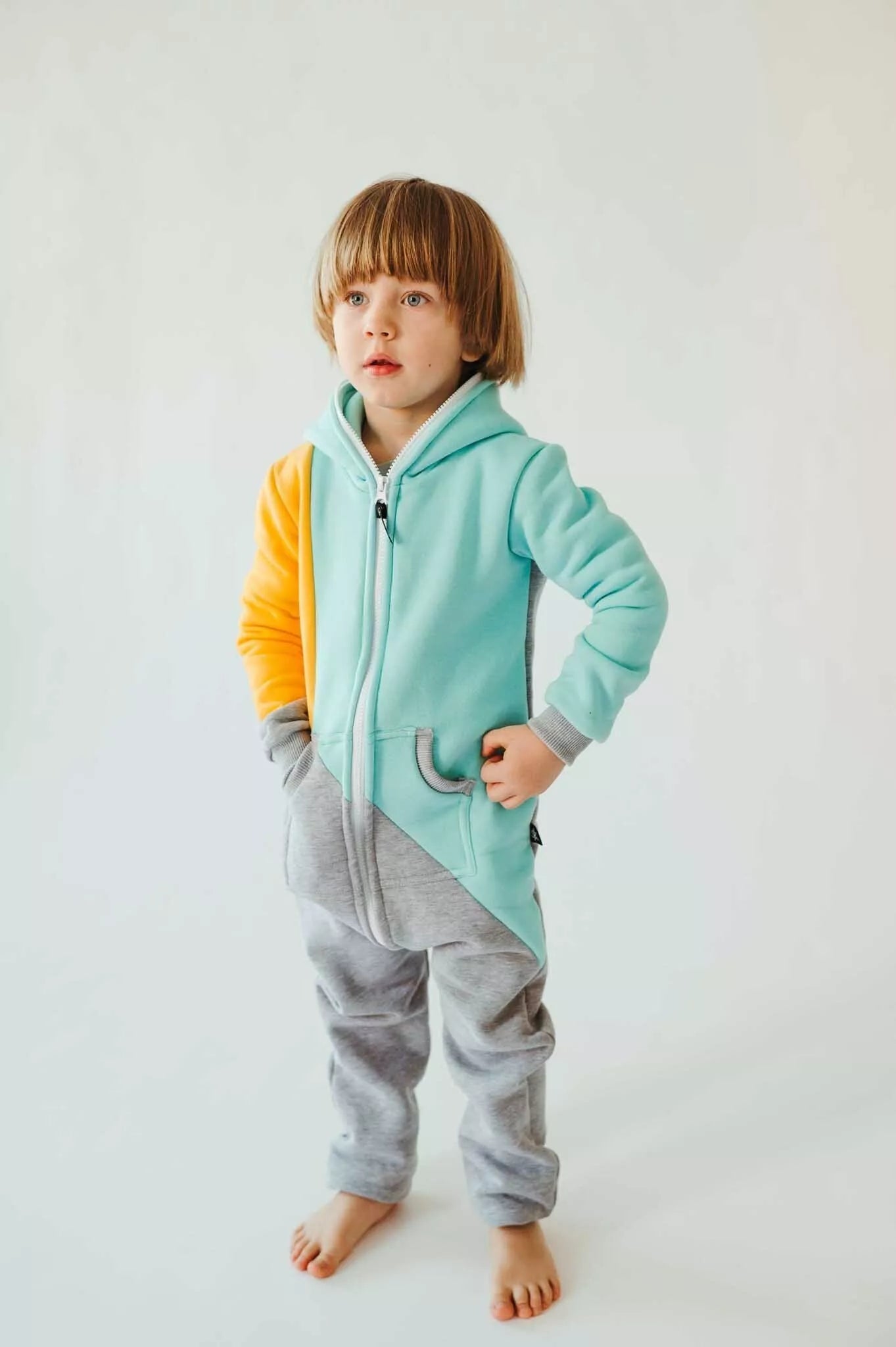 Šiltas jaukus vaikiškas trispalvis kombinezonas, tiek mergaitėms tiek berniukams, skirtas visai šeimai. Geltona rankovė mėtinės spalvos viršus ir šviesiai pilka apačia,nugaroje geltona kišenė (jei neradote pageidaujamos spalvos susiekite) kombinezono ir pačių rankogalių. vaiko ar visos šeimos iniviualumui pabrėžti (užsakant kombinezonus šeimai suteikiame nuolaidas - susisiekite). Priekyje kišenės apsiūtos rankogalių medžiaga. Medžiagos vidinė dalis su tankiu pūkeliu, kuris sukuria įpatingą šilumos jausmą ir norą vilkėti kombinezoną nuolat. Sofa Killer kombinezonų modeliai nevaržo judesių, tad puikiai tinka tiek pasyviam tiek aktyviam poilsiui, net miegui. Galite rinktis iš plačios dydžių skalės, o pats rūbas tradiciškai turi būti laisvas, tad kiek didesnis dydis puikiai tiks. Dekoruota Sofa Killer logotipu.