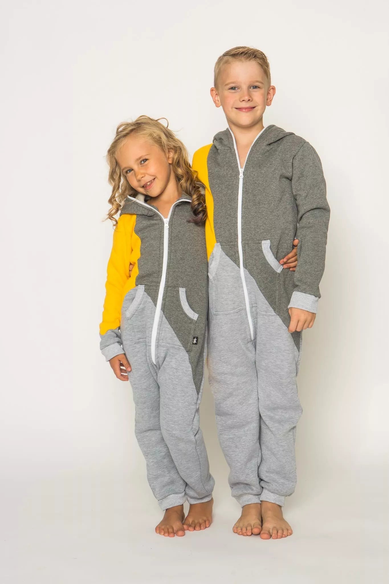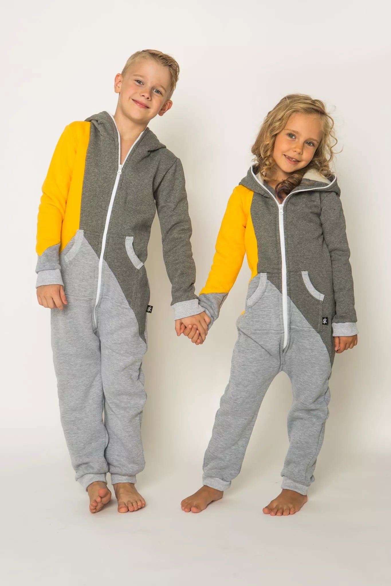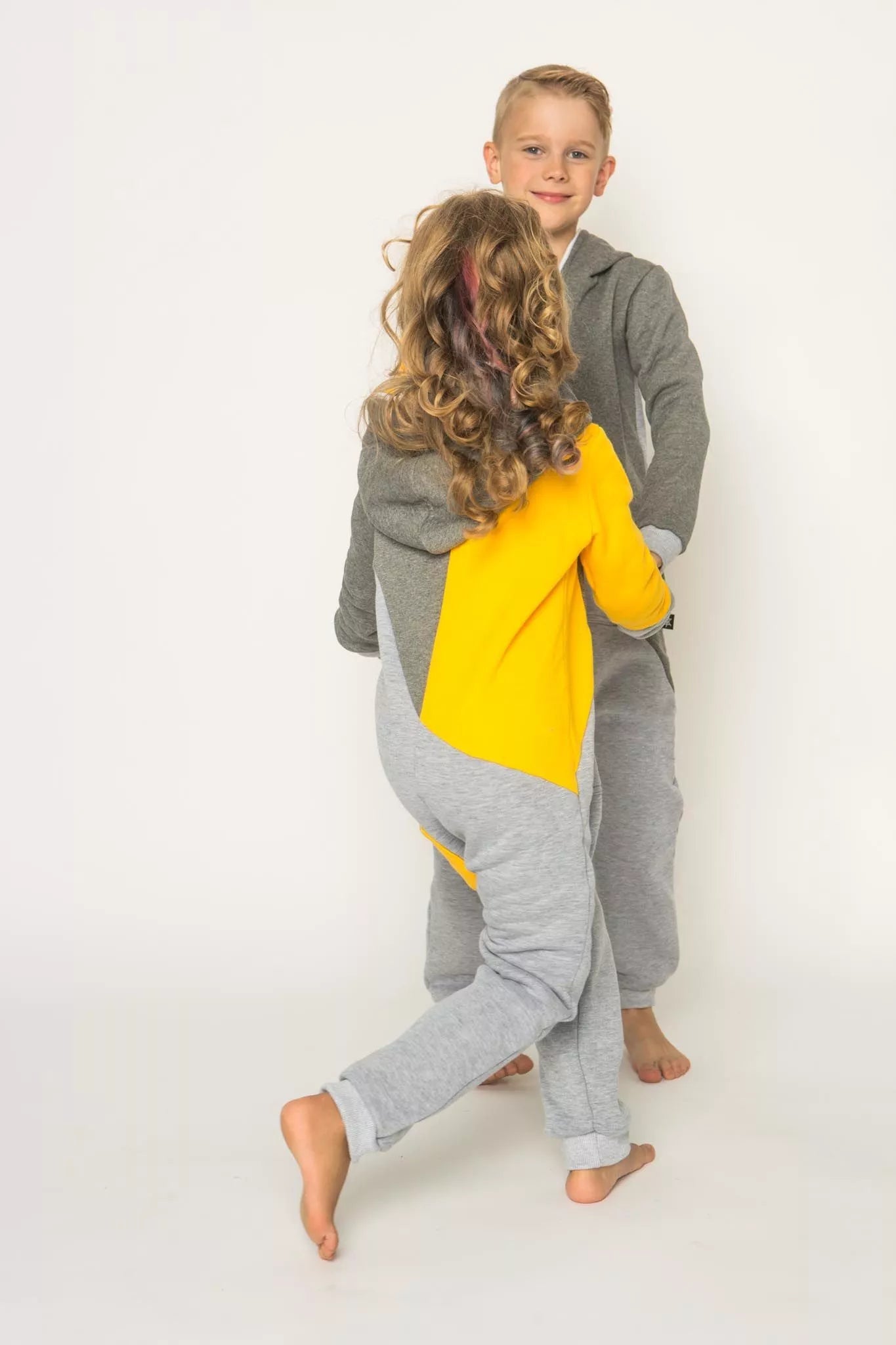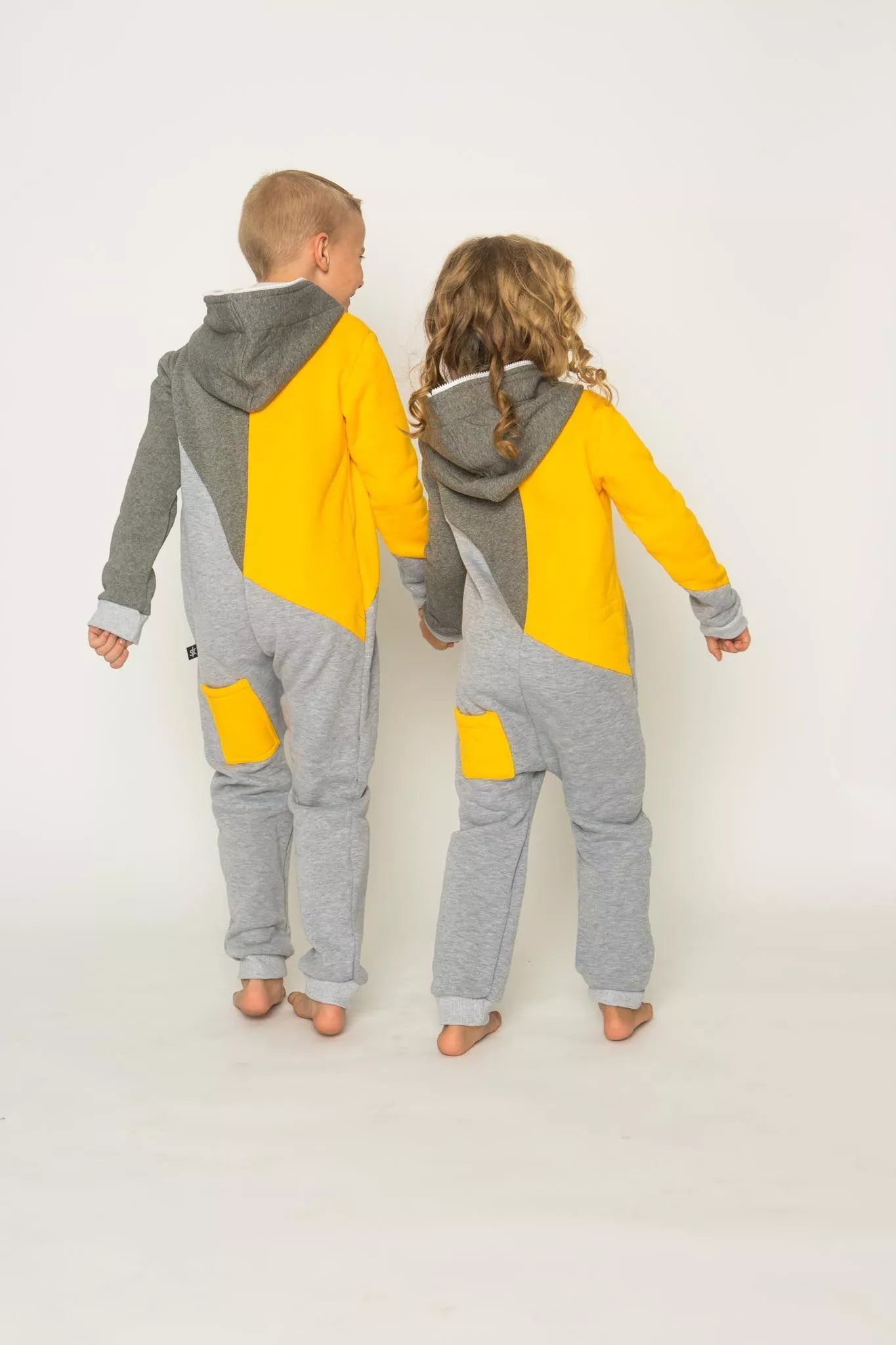 Šiltas jaukus vaikiškas trispalvis kombinezonas, tiek mergaitėms tiek berniukams, skirtas visai šeimai. Geltona rankovė ir dvi pilkos spalvos, nugaroje geltona kišenė (jei neradote pageidaujamos spalvos susiekite) kombinezono ir pačių rankogalių. vaiko ar visos šeimos iniviualumui pabrėžti (užsakant kombineonus šeimai suteikiame nuolaidas - susisiekite). Priekyje kišenės apsiūtos rankogalių medžiaga. Medžiagos vidinė dalis su tankiu pūkeliu, kuris sukuria įpatingą šilumos jausmą ir norą vilkėti kombinezoną nuolat. Sofa Killer kombinezonų modeliai nevaržo judesių, tad puikiai tinka tiek pasyviam tiek aktyviam poilsiui, net miegui. Galite rinktis iš plačios dydžių skalės, o pats rūbas tradiciškai turi būti laisvas, tad kiek didesnis dydis puikiai tiks. Dekoruota Sofa Killer logotipu po kišene.