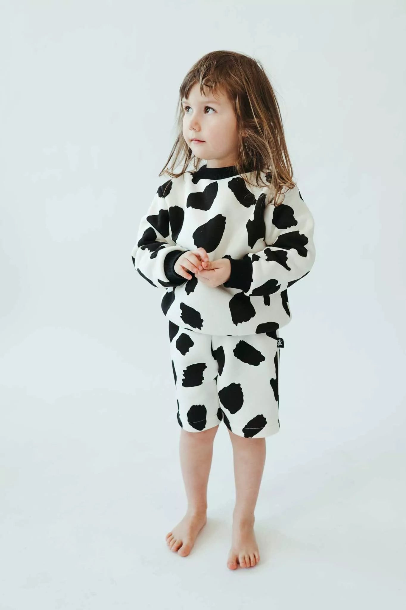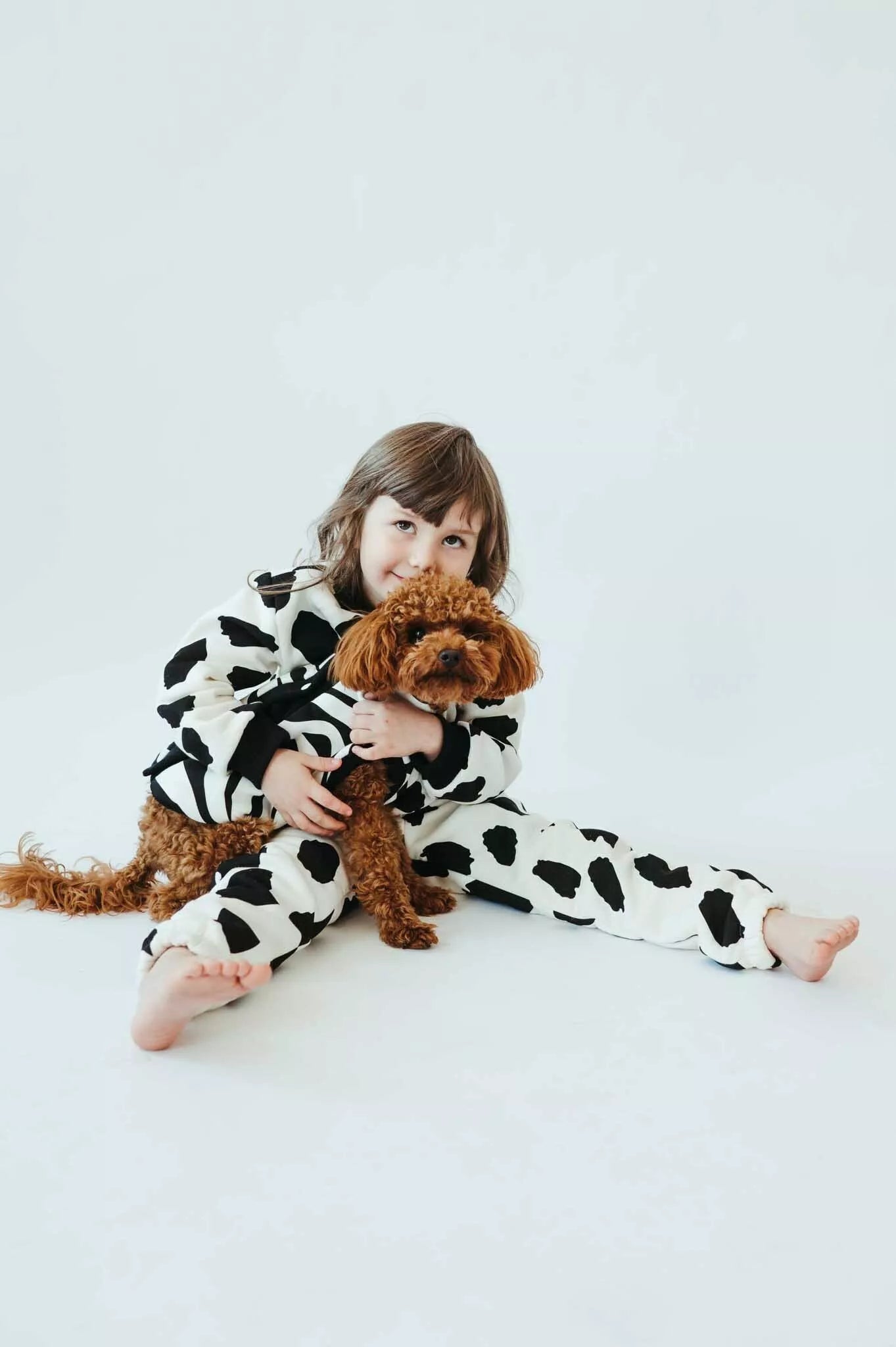 Jaukus vaikiškas karvės rašto, baltos spalvos laisvalaikio džemperis, tiek mergaitėms tiek berniukams, skirtas visai šeimai. Vaiko ar visos šeimos iniviualumui pabrėžti (užsakant laisvalaikio džemperių šeimai suteikiame nuolaidas - susisiekite). Džemperis toks jaukus, kad sukuria įpatingą šilumos jausmą ir norą vilkėti laisvalaikio džemperį nuolat. Sofa Killer laisvalaikio modeliai nevaržo judesių, tad puikiai tinka tiek pasyviam tiek aktyviam poilsiui, net miegui. Galite rinktis iš plačios dydžių skalės, o pats rūbas tradiciškai turi būti laisvas, tad kiek didesnis dydis puikiai tiks.
